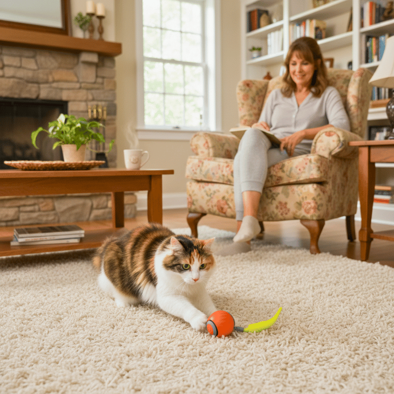 I’m away most of the day, and this keeps my cat busy without help. Quiet, smooth, and works great on carpet.